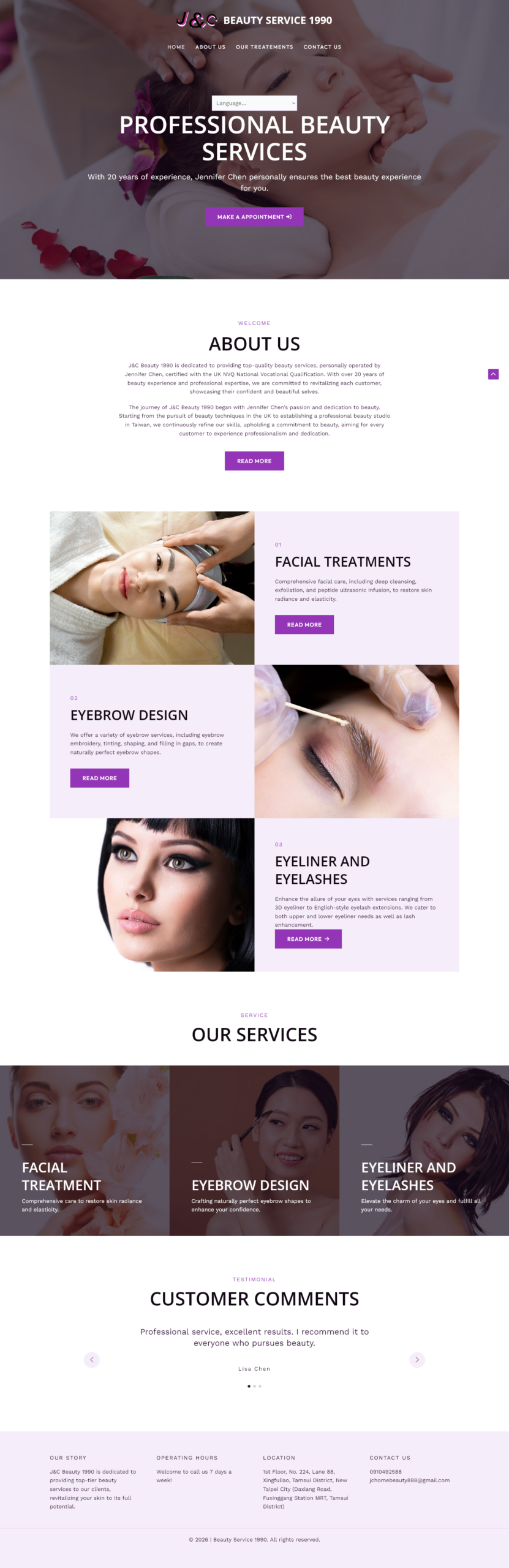 優雅且具居家親和力的簡潔設計。透過柔和的色調搭配高清晰度的實境照片,成功營造出美容產業所需的精緻感與放鬆氛圍;版面配置以服務導向為核心,將專業資歷與客戶評價透明化呈現,不僅建立起深厚的專業信任度,更傳遞出一種精緻、細膩且以客為尊的品牌服務特質。